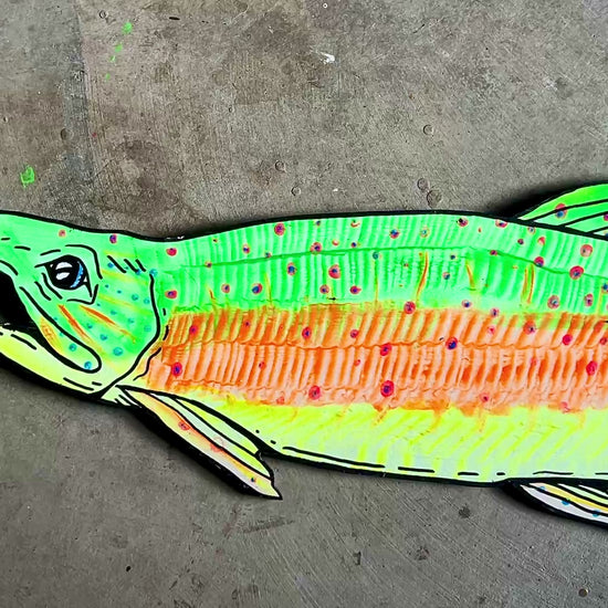 Created for an art installation at our festival, these psychedelic salmon are now for sale! Featuring a variety of salmon native to the Pacific Northwest. These hand-painted, plywood pieces were made with UV/light reflective paint that also glows in the dark.